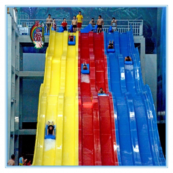 競賽滑梯是水上樂園設(shè)備一種常見的滑梯,這種滑梯可以為3到8道,同時為多人游樂。占地面積根據(jù)滑梯條數(shù)和平臺高度而定,1人一道。平臺
